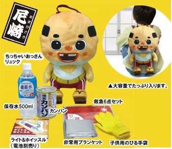 ちっちゃいおっさんリュック・5年保存水・カンパン・子供用手袋・非常用ブランケット・ライト付きホイッスル(電池別売)・救急6点セット[カット綿・綿棒・絆創膏(大・小)・マスク・ポーチ]